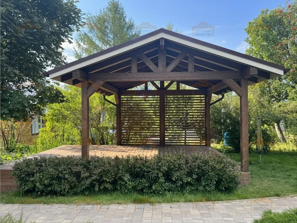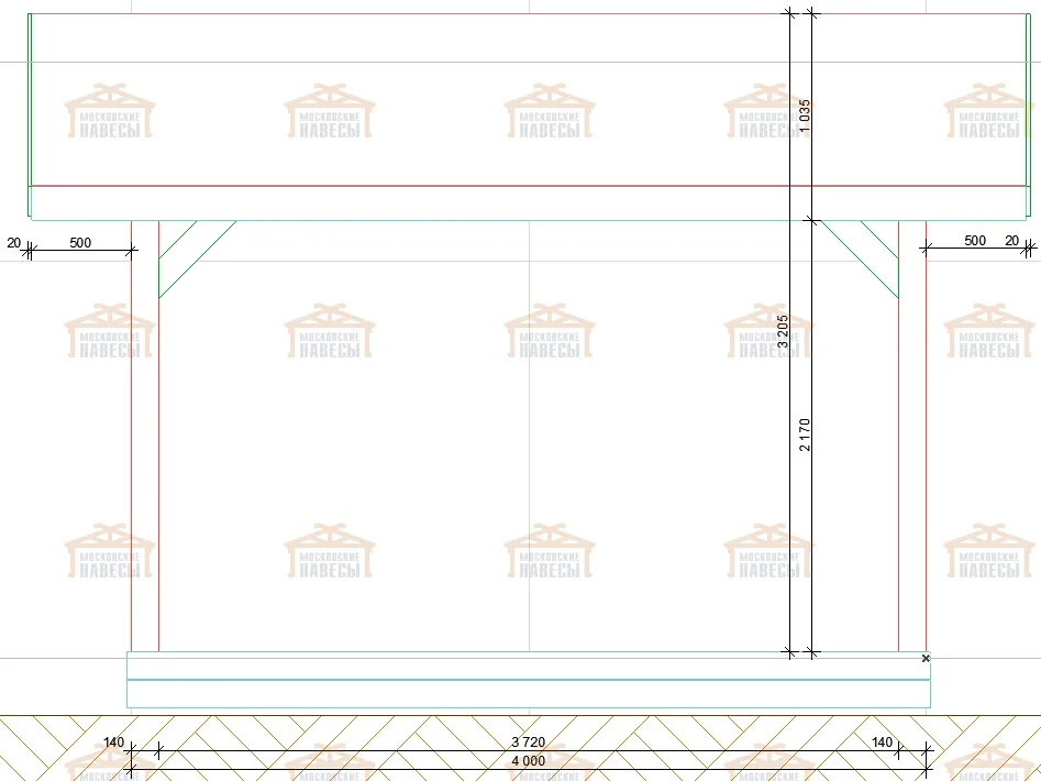 | Стойки (столбы навеса) | Массив бруса сечением 190×190 мм Примечание: возможно естественное растрескивание, которое никак не влияет на надежность. Во избежание этого необходимо использовать клееный брус |