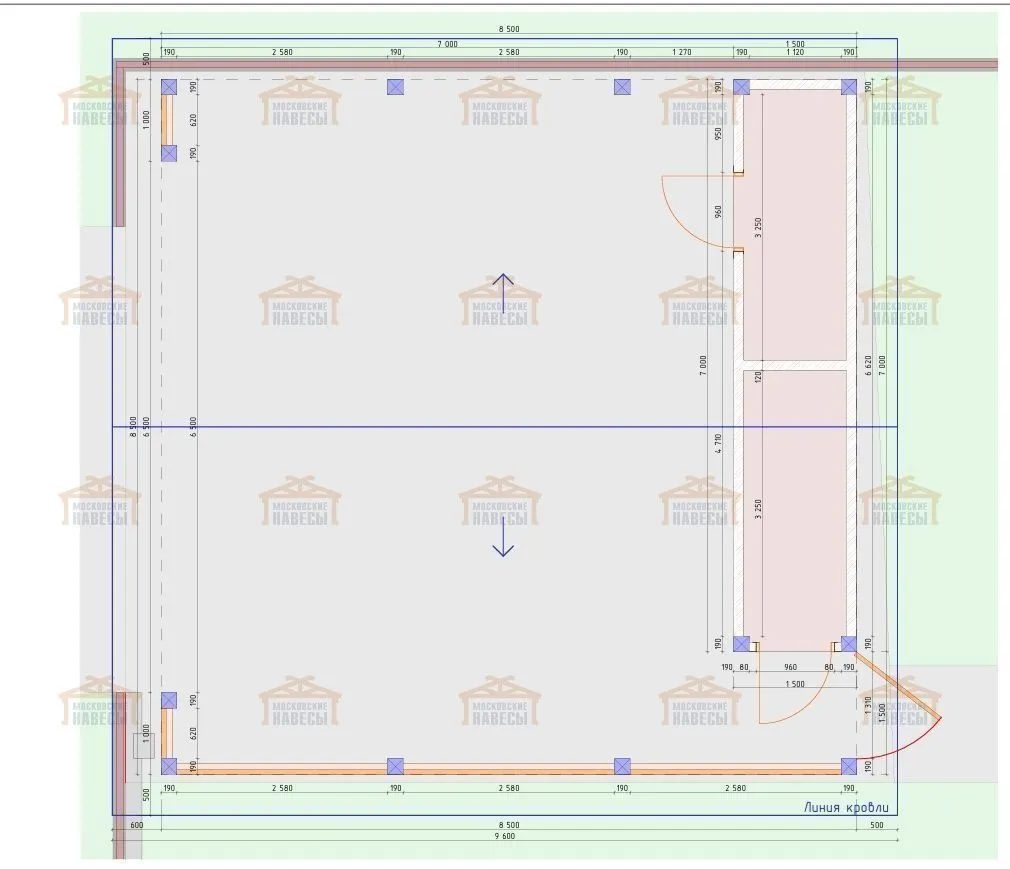 Размер: 8.5×8.5 м Площадь (по стойкам): 72 м² Срок производства: 55 день Срок монтажа: 14 дня