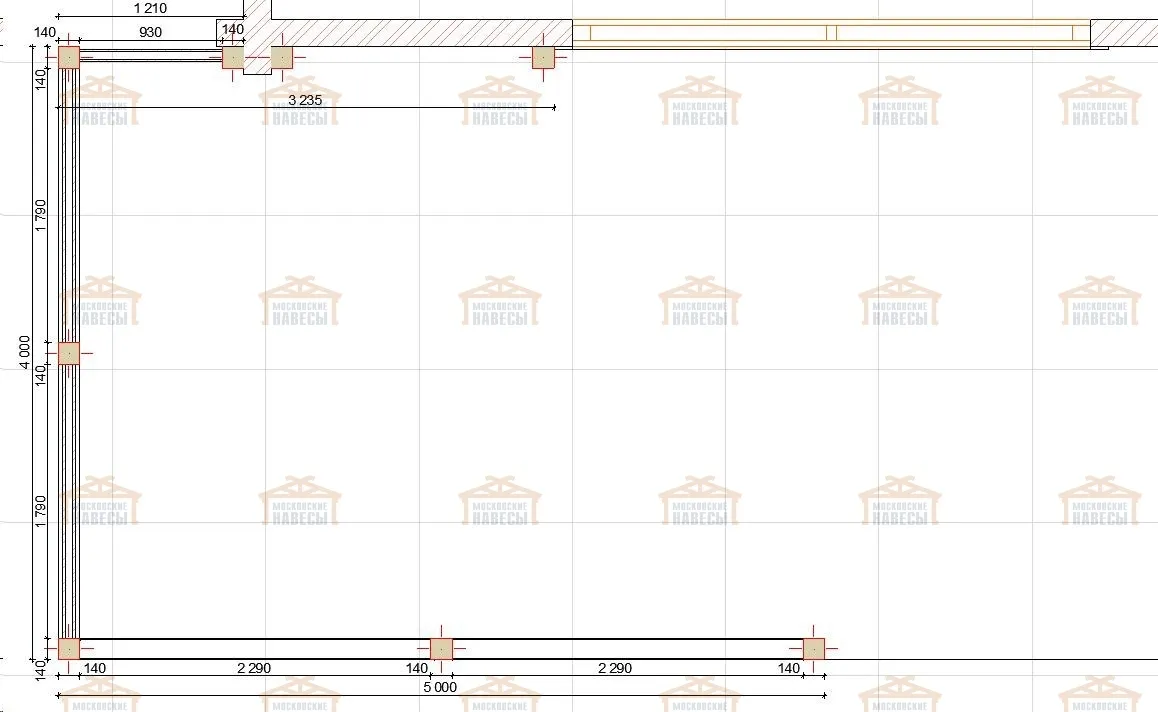 Стойки (столбы навеса) | Массив бруса сечением 140×140 мм Примечание: возможно естественное растрескивание, которое никак не влияет на надежность. Во избежание этого необходимо использовать клееный брус |